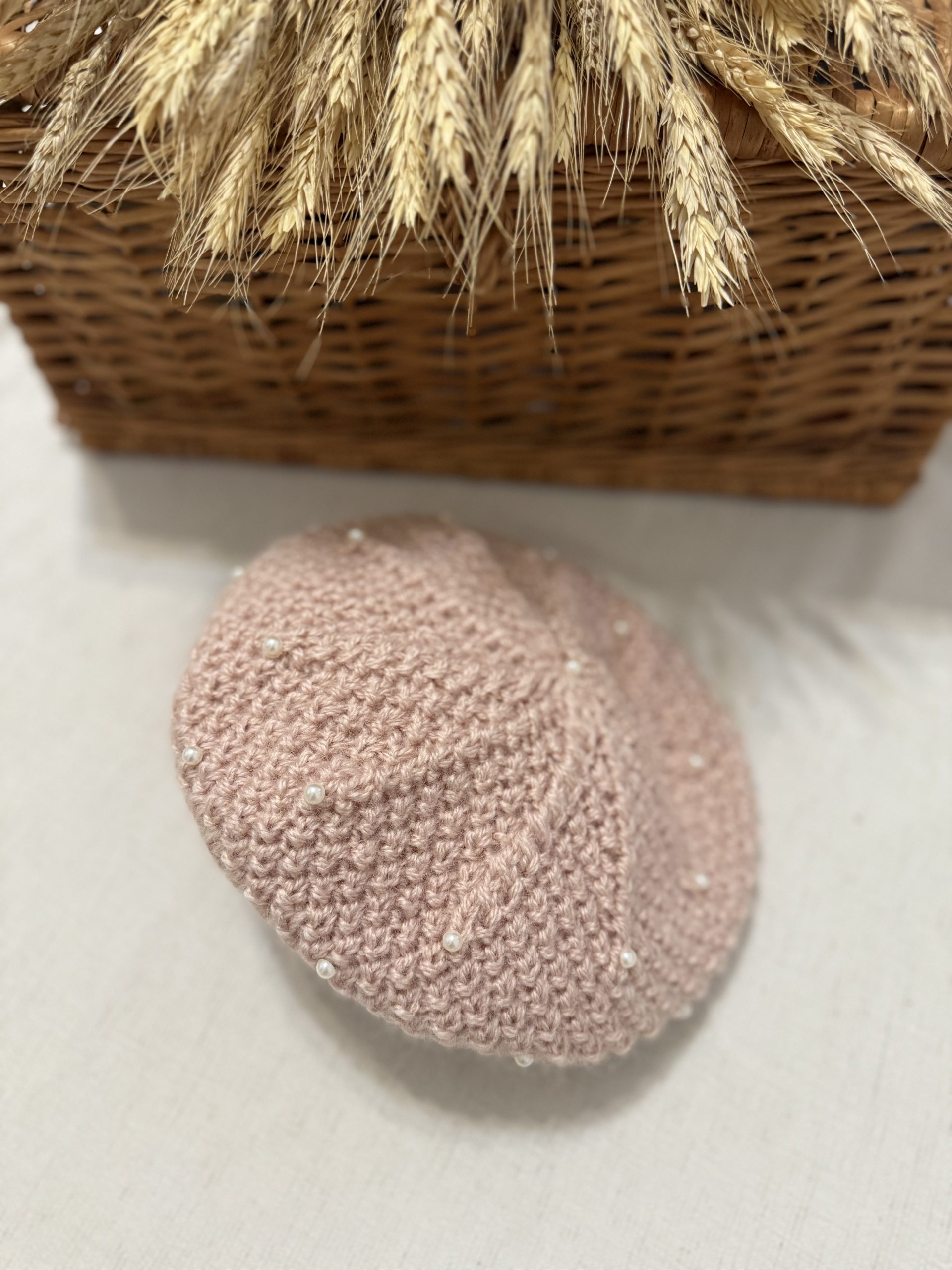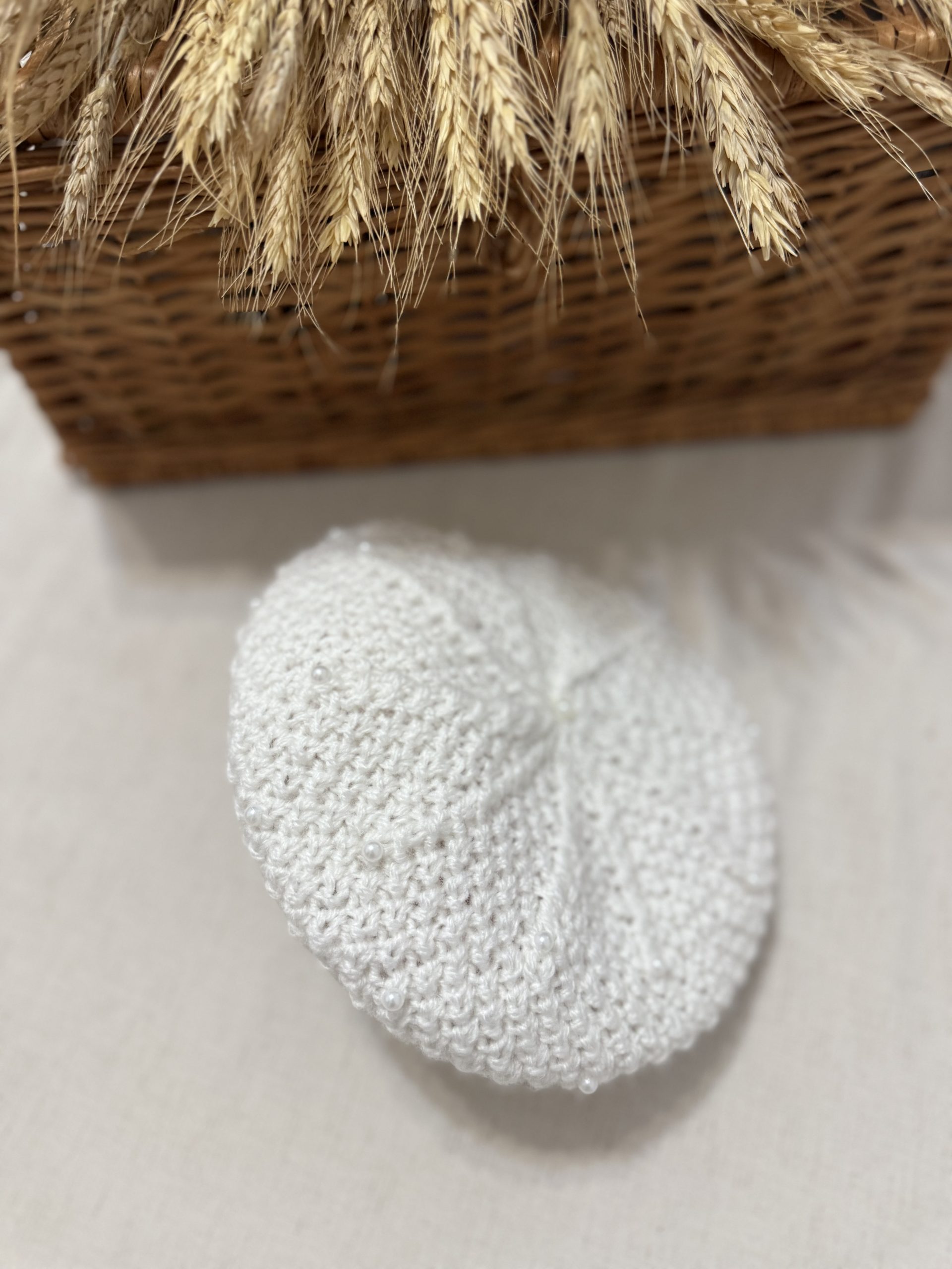 Beretă tricotată manual este realizată dintr-un fir moale, într-o nuanță delicată de crem deschis, care emană eleganță și rafinament.