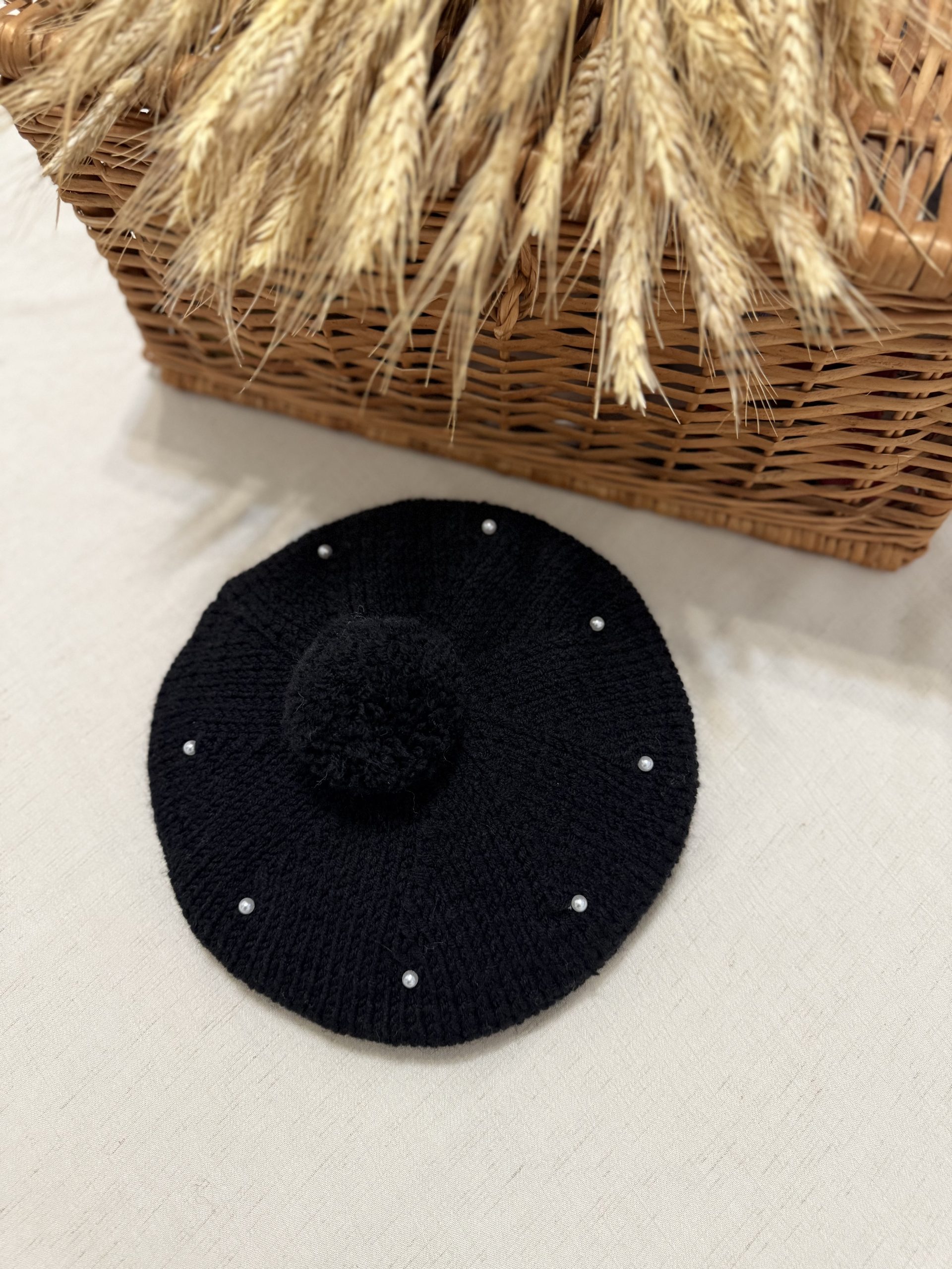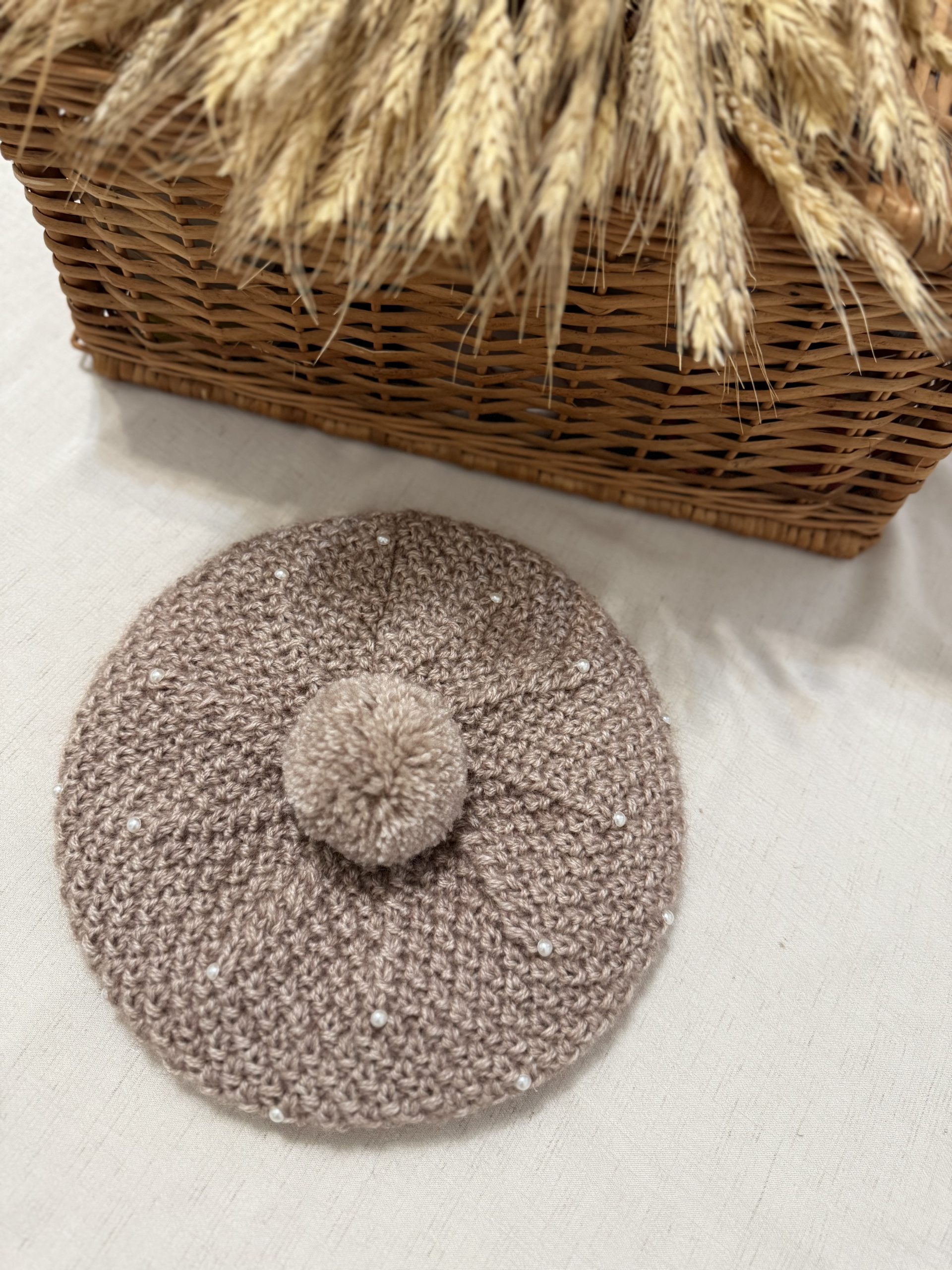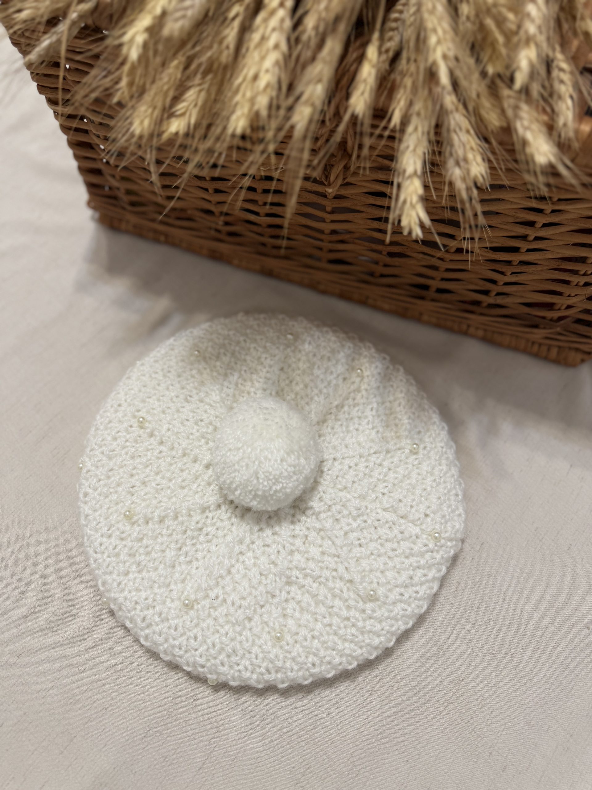 Beretă tricotată manual, decorată cu mici perle albe.
