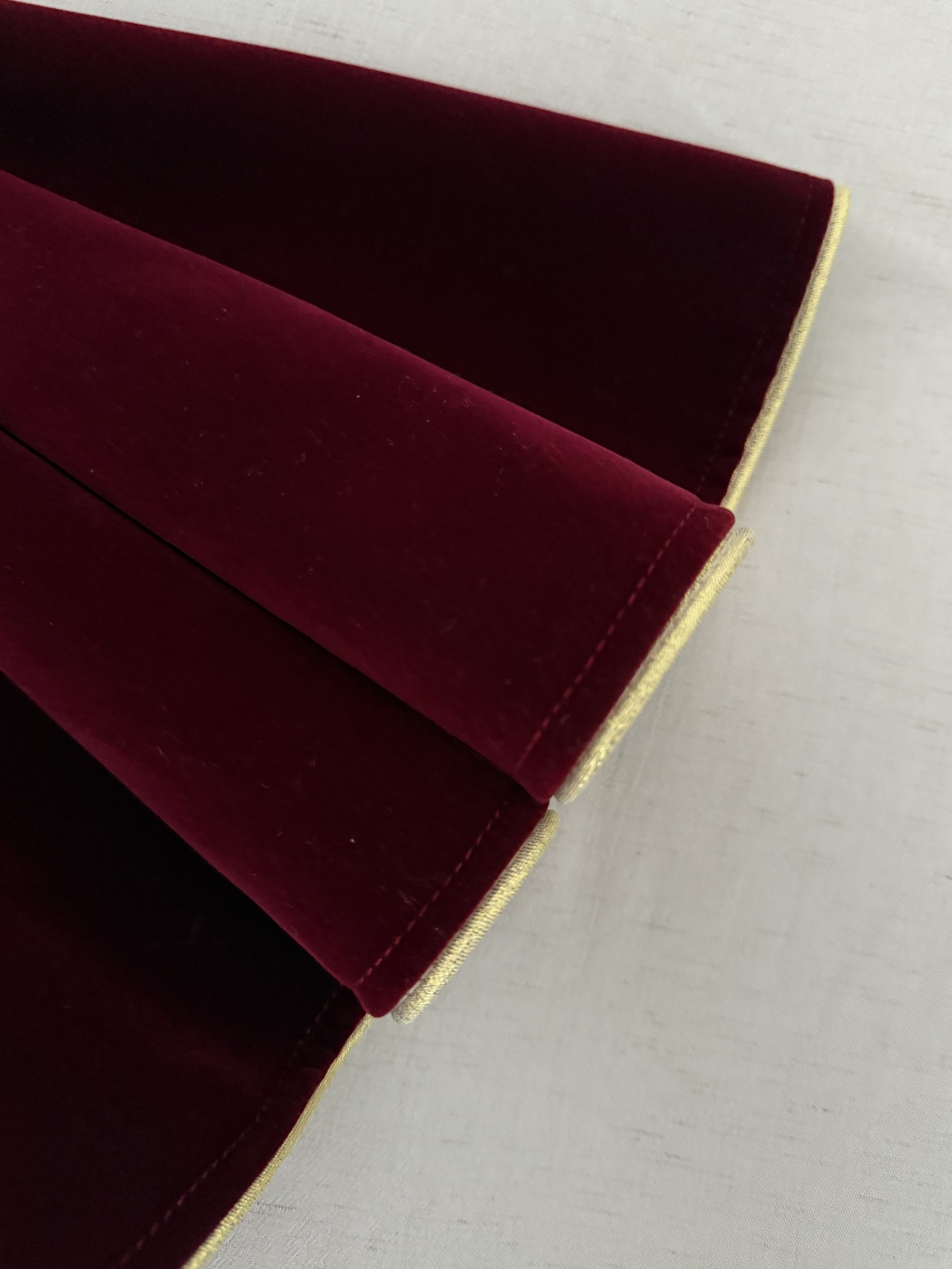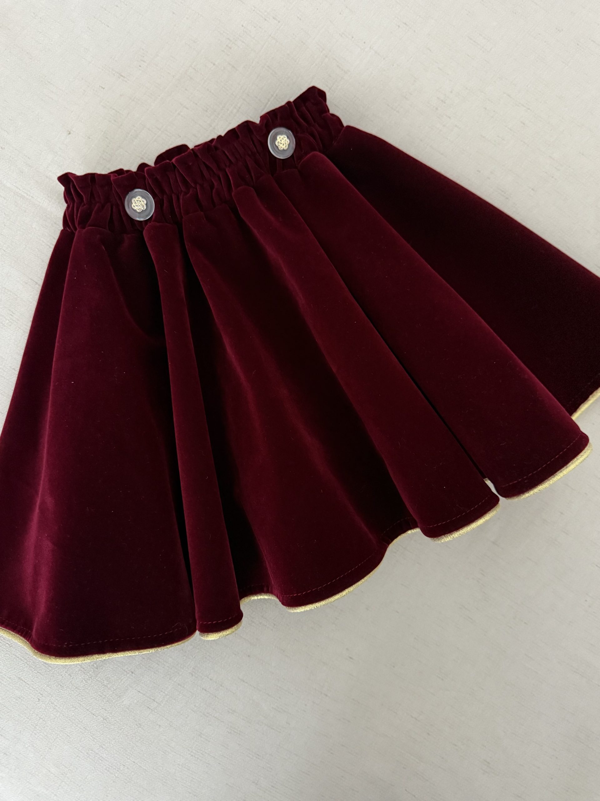 Fustă din catifea cu talie elastică, croială în cloș și margine aurie, ideală pentru ocazii speciale și sărbători, oferind eleganță și confort.